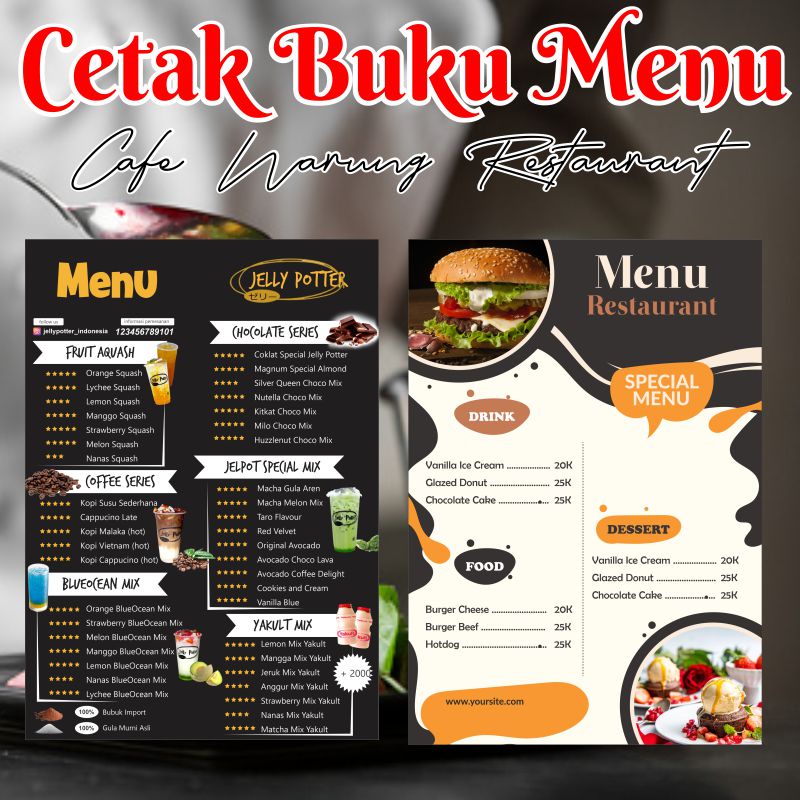 Harga murah di lapak wijaya store. ✓ pengiriman cepat ✓ pembayaran . Cetak daftar menu makanan minuman cafe custom a3 a4. Pilih dari 2090+ templat yang menarik untuk membuat . Ambil inspirasi dari ratusan template daftar menu makanan dan minuman yang dibuat para .